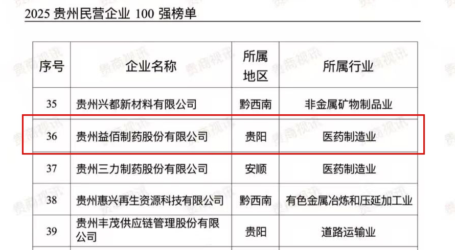 实力蝉联!益佰制药再度跻身贵州民营企业100强